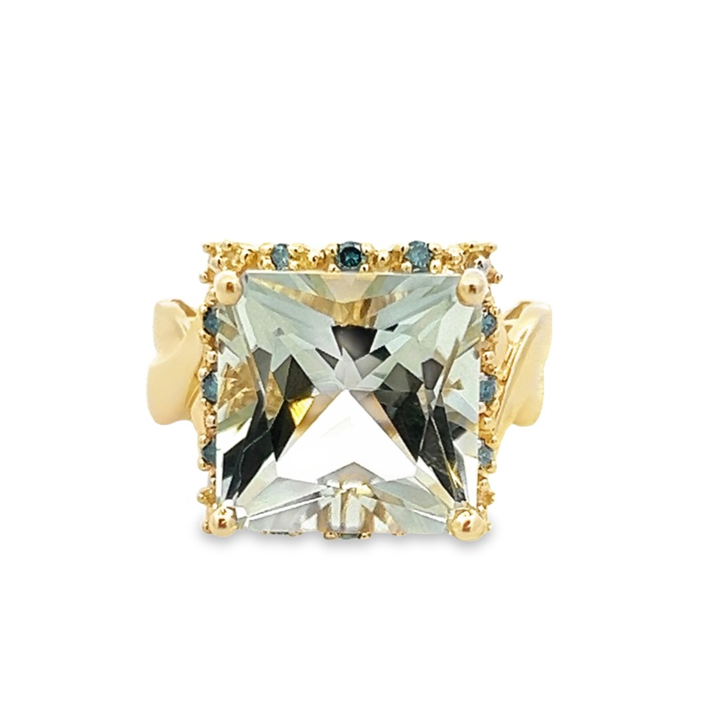 Estate 14 Karat Yellow Square Prasiolite & Blue Diamond Ring Estate Jewelry Size 8 With One 13.00X13.00Mm Princess Green Amethyst And 12 0.18Tw Round Si2 Blue Diamonds Gram Weight: 7.7Jewelry Type: Color Fashion