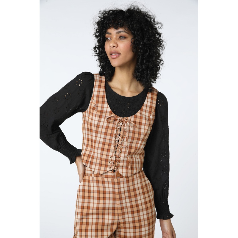 Toffee check vest- a tonal retro inspired check, with a low key vibe- corset style vest with a lace up front opening- front ribbon fastening- rounded neckline- cropped length- fully lined- made of a comfortable polyester, viscose, elastane blend- available