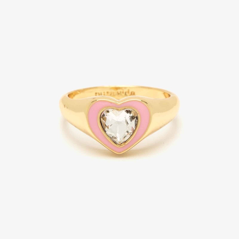 Look no further: you've uncovered the perfect signet style for Valentine's Day and beyond. True to the other Stone and Enamel pieces in this collection, these rings features clear glass, heart-shaped center stone surrounded by beautiful enamel detail set o