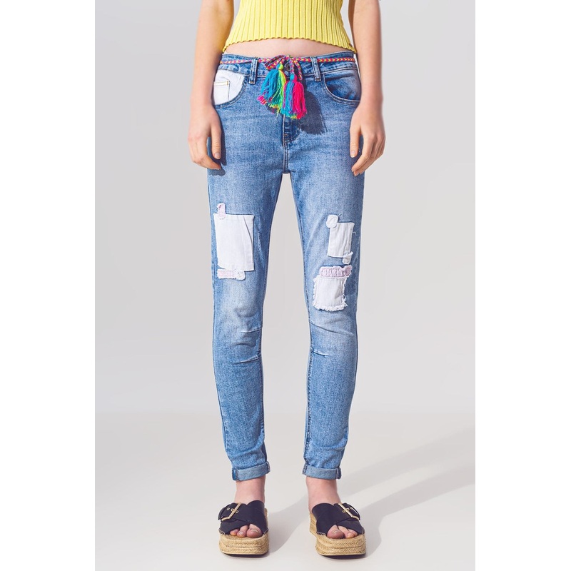 Stretch Skinny Jeans With Patches In Mid Wash And Belt Detail