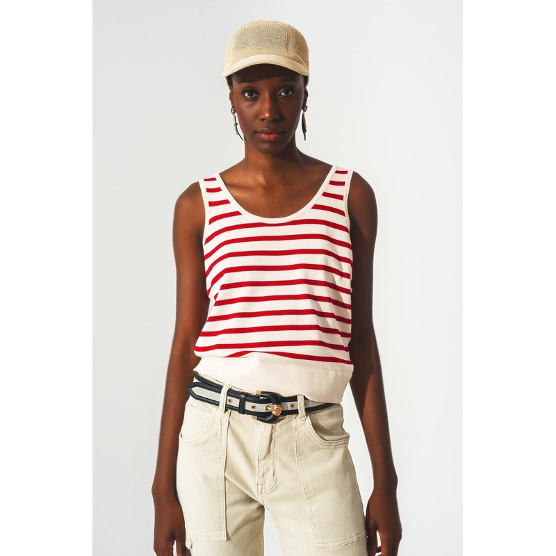 Length: Cropped length. Subcategory: Top. Neck: Crew neckline. Sleeves: Sleeveless style. Print: Stripe design. Fit: Bodycon fit. Style: Daily. Fabric: Fine Knit. runs true to size. S.
