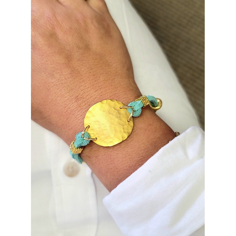A unique suede bracelet that is super stylish. Made in three different options with gold plated hammered disc. 7.5 inches, adjustable, lobster clasp.