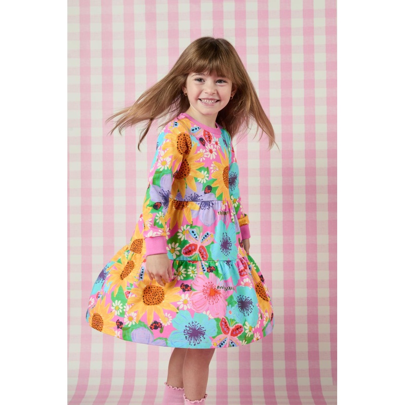printed cotton loopback sweater dress for kids- soft cotton loopback terry fabrication- soft gathering through layered tiers- rounded neckline- rib finish at neckline, cuffs and hem- relaxed fit- finishes at knee- perfect for everyday wear- features exclus