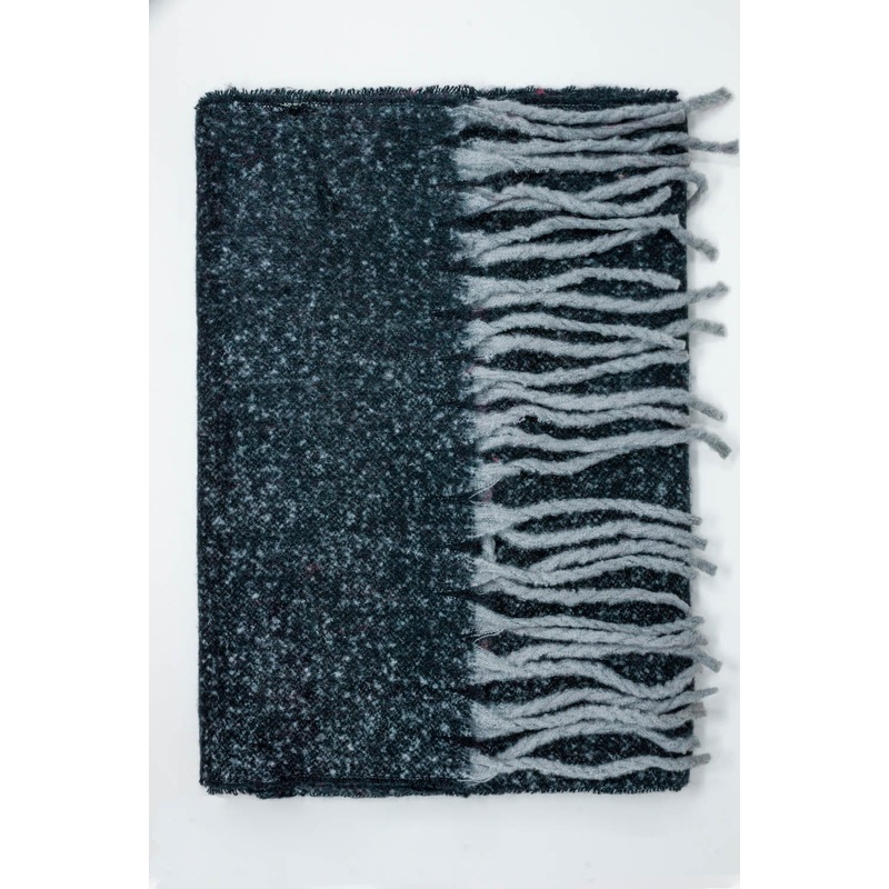 A soft and fluffy chunky-knit rectangular casual scarf in classic black with marbled gray hues with gray fringe on each end. The fabric is 100% Acrylic. One size fits all.