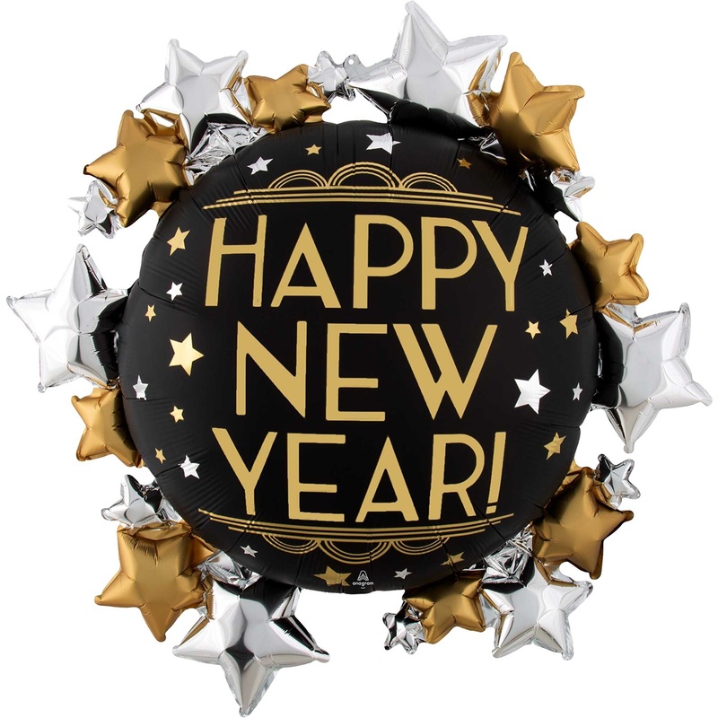 Item Includes:Foil balloon.Features:Black round foil balloon with "Happy New Year" text.Attached silver and gold star balloons around border.Sizing:76cm / 30in.Material:100% Foil.Please note: Balloons do not come inflated. Helium not included.Bring on the
