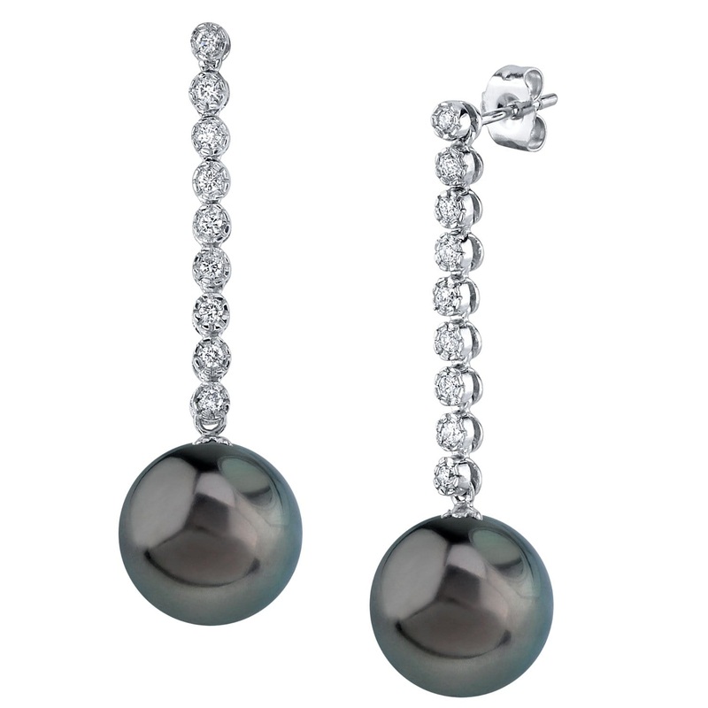You'll appreciate the elegance of these stunning earrings. Crafted with exquisite black Tahitian pearls, they offer a unique charm that will catch everyone's eye. The slim, modern design, paired with sparkling diamond accents, makes them perfect for a glam