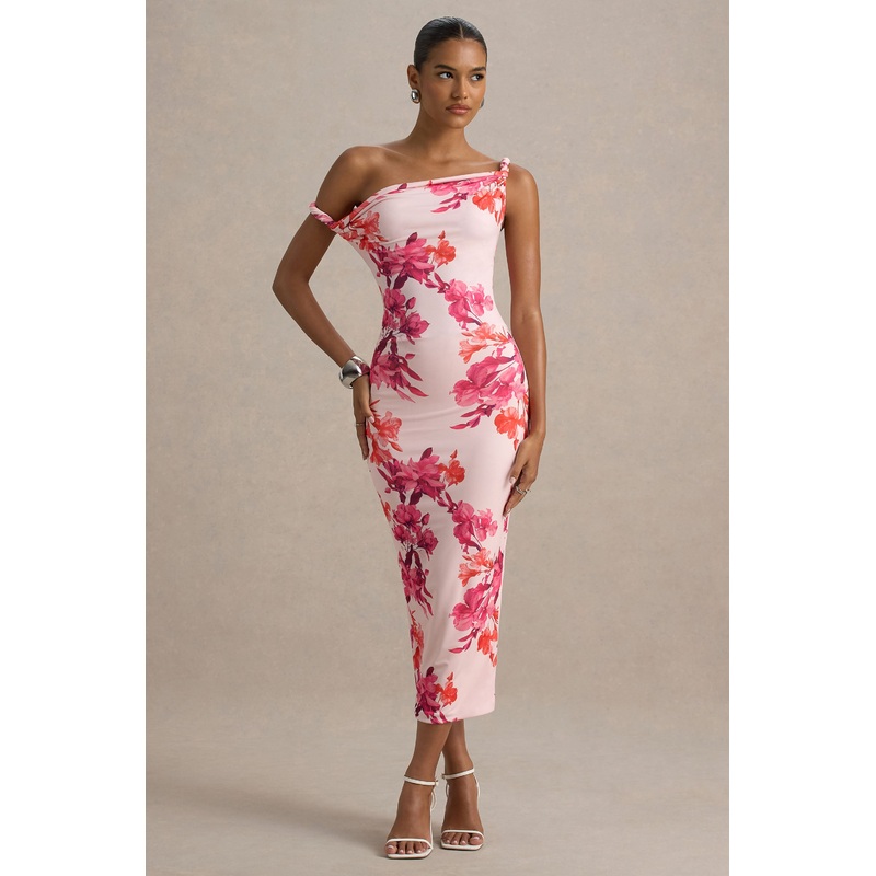 Stand out from the crowd this season in Tatian. Crafted from our premium stretch jersey, in our show stopping pink and orange print, in this midi you will turn heads in any room. Finished with a feminine asymmetric neckline, that is elevated with a twist detail adding a modern edge. From garden parties to date nights, Tatian is a must have in your wardobe. Style this piece with a chic up do and gold jewellery for a look of effortless elegance.