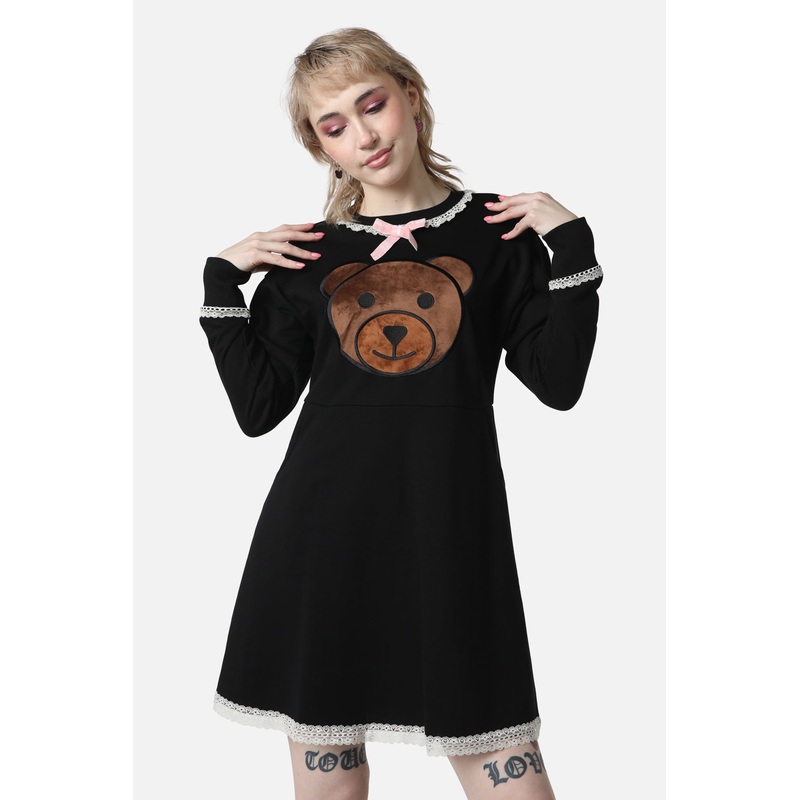Black Dress- Teddy Face Applique On Front- Long Sleeves- Relaxed Fit- Flared Skirt- Round Neckline- Lace Trim At Beck, Sleeve Hems And Hem- Bow At Centre Front- Made From Cotton Loop Back- Available In BlackProduct Code: DGFW265
