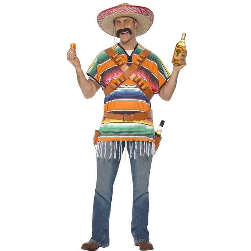 Item Includes:Poncho.Belt.Bandolier.Fit and Sizing:One size fits most adults.Fabrics and Care:100% Polyester.Hand wash, hang dry.Please note: Jeans, tequila, shot glasses, and moustache is not included. We recommend the responsible drinking of Alcohol. Ano