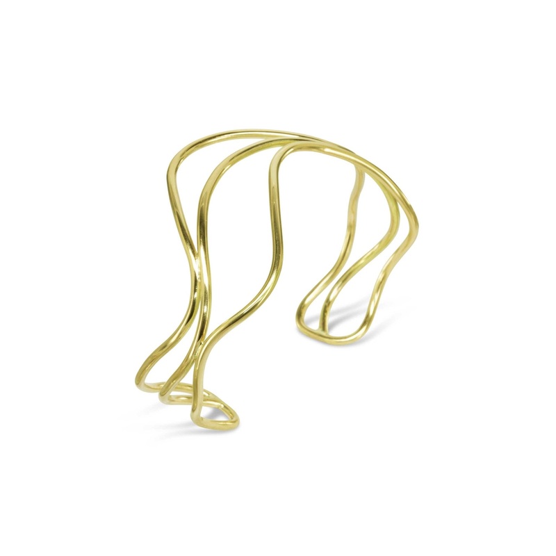 The Three Strand Asymmetric 9ct Solid Gold Bangle is handmade with care. Three strands of 9ct yellow gold, beautifully intertwined to create a stunning wave pattern.Specifics: The strand section is 2mm round and weighs approximately 22g. The width at the f