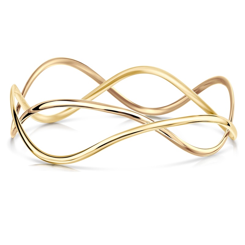 This Tidal bangle in classic 9ct yellow gold features two linked, flowing bangles, curved into shapes reminiscent of waves. The bangle creates unique, elegant shapes every time you move your wrist.Sheila took inspiration for this collection from the Pentla