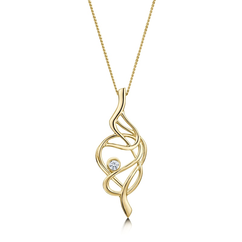 This Tidal pendant in classic 9ct yellow gold features a sparkling 3.5mm diamond, set by hand within an elegant design of interlaced gold, hand-finished in our Orkney workshop. The pendant design hangs elegantly from a gold curb chain and measures approxim
