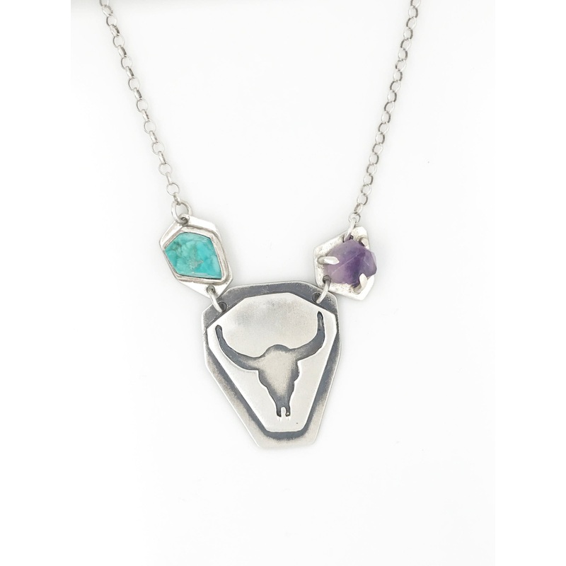 Hand carved in Sterling Silver by Pattie Parkhurst, this longhorn skull design will be the talk of all of your friends. Attached to the longhorns are, Nevada turquoise and natural amethyst. Longhorns are such a classic motif and can be worn year round.