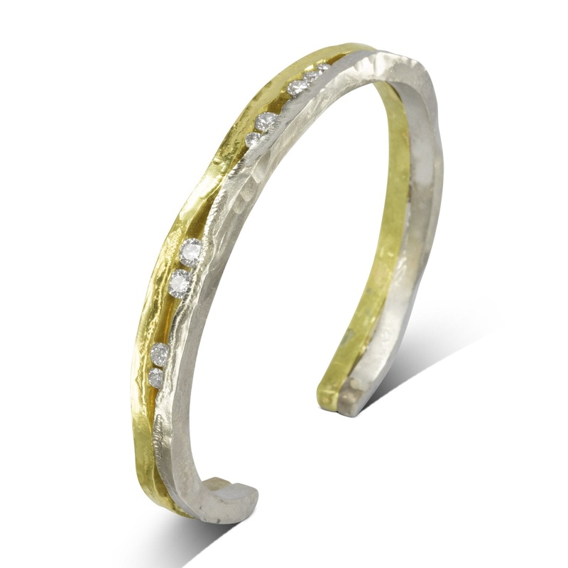 The Trap Mixed Gold Large Diamond Bangle combines the beauty of white and yellow gold with diamonds. With its side hammering and textured finish, this bangle is sure to make a statement.Bangle Design:Inspired by the look of pebbles trapped in wood along th