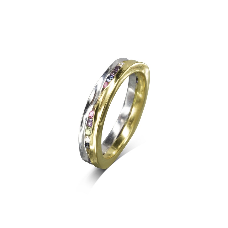 The Trap Pink, Blue Sapphire and Diamond Eternity Ringfeatures a unique trapped setting that securely cradles the gemstones, while also allowing them to catch the light and sparkle beautifully.Innovative Trapped Setting: The distinctive trapped setting of