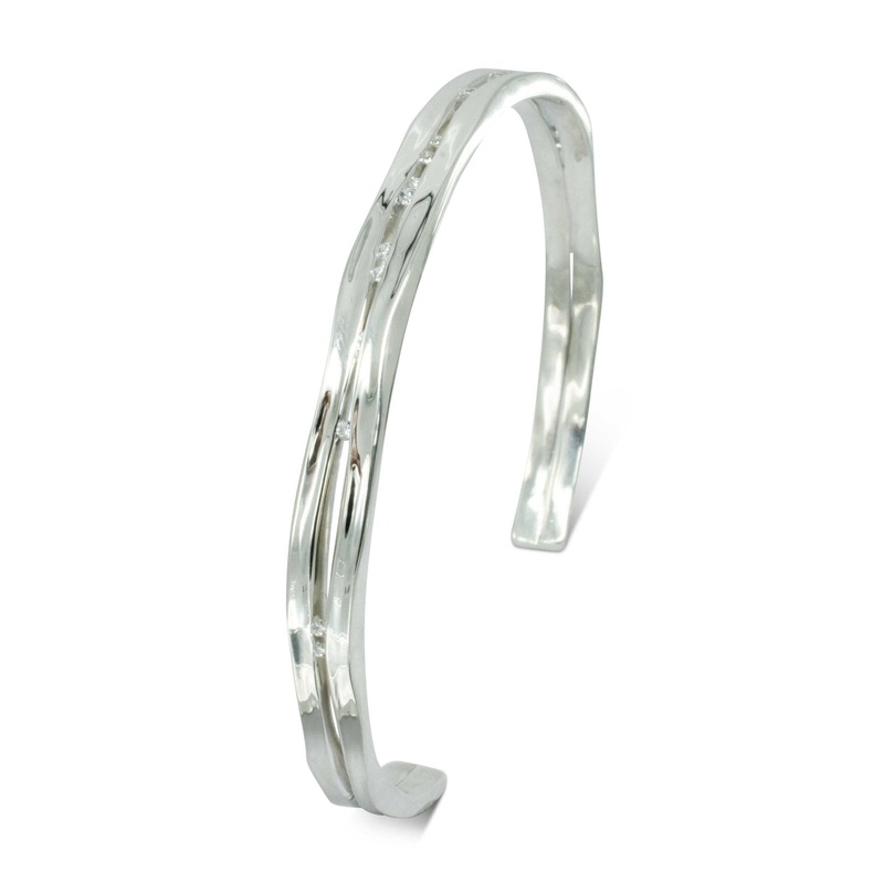 The Trap Solid White Gold Diamond Bangle combines the beauty of white gold with diamonds. With its side hammered texture and sleek design, this bangle is sure to make a statement.Bangle Design:Inspired by the look of pebbles trapped in wood along the ever-