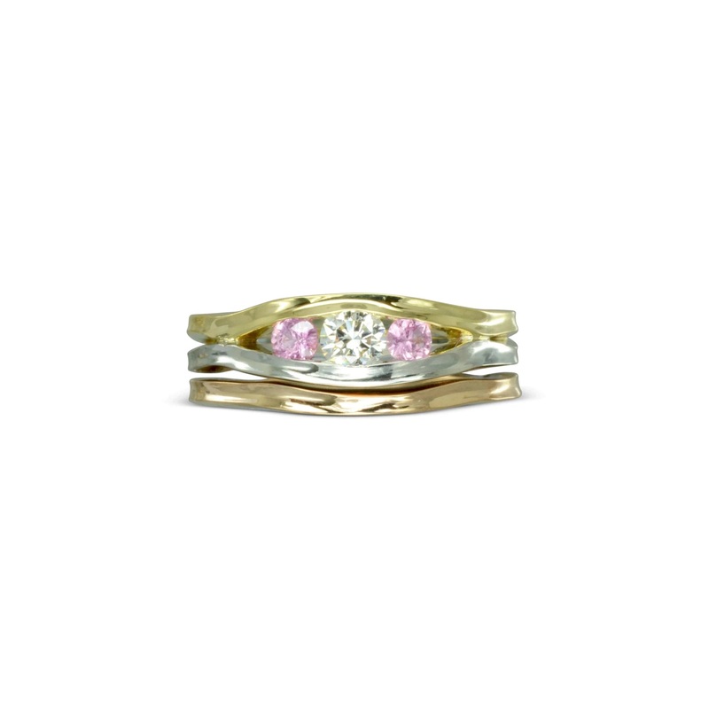 The Trap Trilogy Diamond and Pink Sapphire Engagement Ring Set is a delicatepiece inspired by pebbles trapped in wood along the Sussex coast.