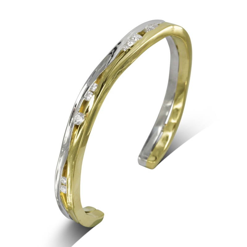 The Trap Mixed Gold Large Diamond Bangle (Polished) combines the beauty of white and yellow gold with diamonds. With its side hammering and polished finish, this bangle is sure to make a statement.