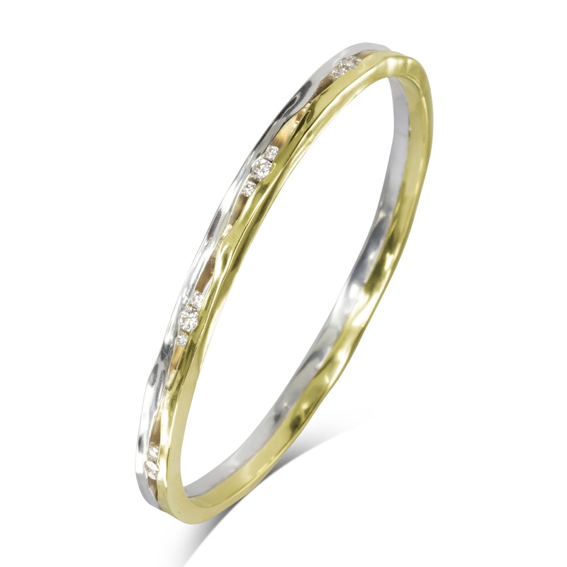 The Trap Yellow and White Solid Gold Bangle 2cts diamonds is a unique and eye-catching piece that combines the warmth of gold with the elegance of white gold accents. This bangle features 9ct white gold and yellow gold, hammered together to trap the diamon