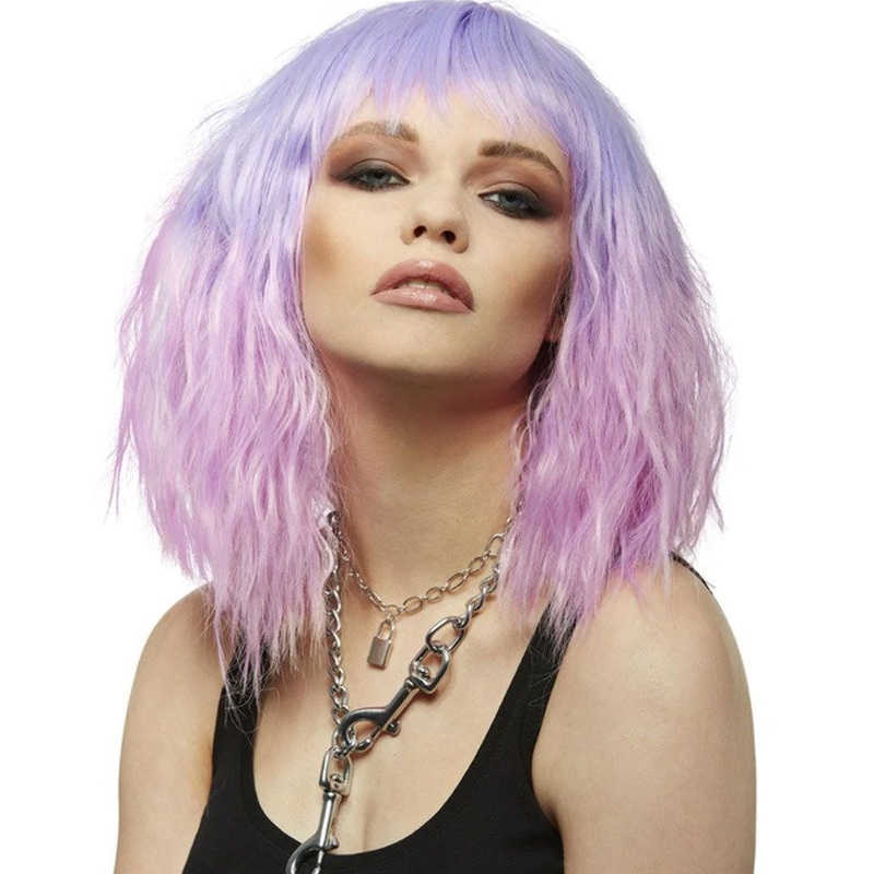 Item Includes:Wig.Fit and Sizing:One size fits most.Material and Care:100% Synthetic.Hand wash.Please note: Jewellery and top not included. Wigs are sent flat packed. For best results style with a brush and hairspray.Rockin' purpleBring some edge to your c