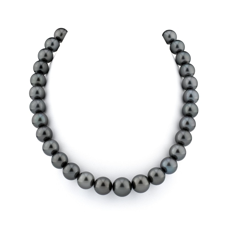 Picture yourself wearing a radiant necklace that captures the essence of sophistication. This piece features shimmering dark silver and steel overtones with hints of peacock, showcasing a stunning array of Tahitian pearls. Each pearl is perfectly round and beautifully matched, graduating from 11.0 to 13.0mm. You’ll appreciate the sharp, crisp luster against the naturally colored dark charcoal grey body. The necklace is delicately double-knotted on matching black silk and finished with an 18K gold clasp, offering a touch of elegance to your ensemble.