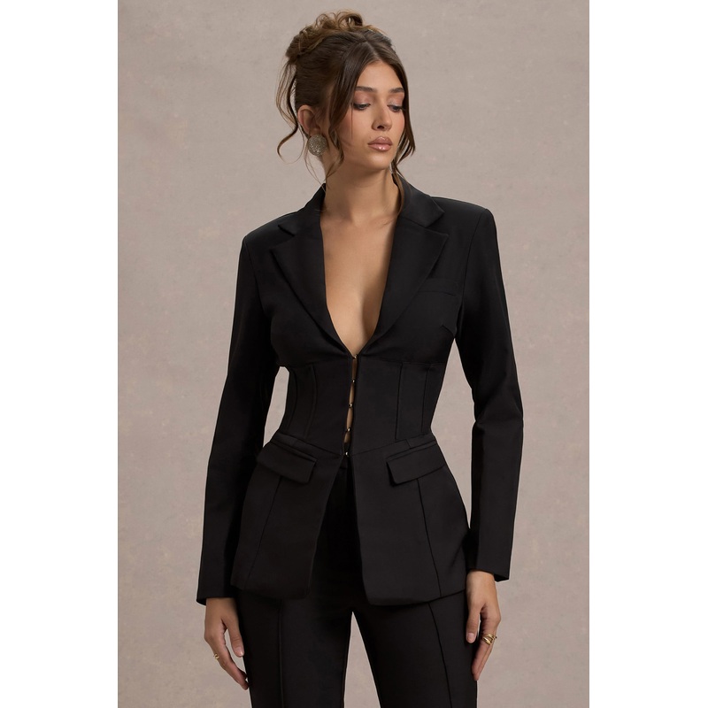 Blazers may be fine for the office but they look even better styled up for special occasions. Our Unbeaten blazer is a prime example, designed in weighted black crepe with a curve-contouring corset, long sleeves and a plunging notched collar. Pair this fit