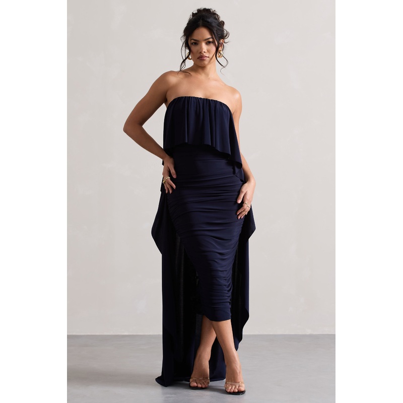 Upon A Time | Navy Ruched Bandeau Midi Dress With Cape