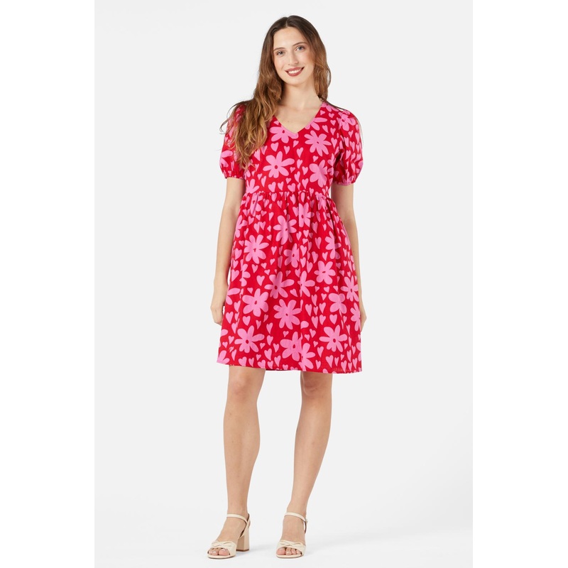 Red mid length dress featuring a two tone heart and daisy print- short length puff sleeves - v-neckline - gathered from waist- handy side pockets- invisible back zipper - crafted from a textured cotton- available in redProduct Code: PGFZ040