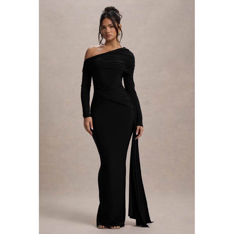 Valina | Black Ruched Asymmetric Maxi Dress With Drape