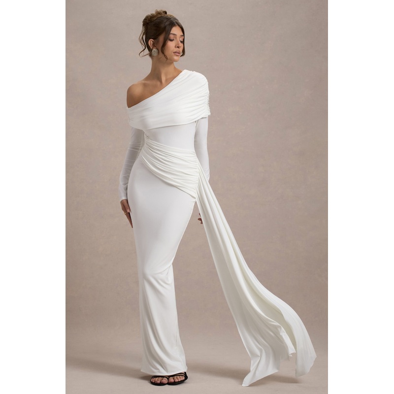 Valina | White Ruched Asymmetric Maxi Dress With Drape