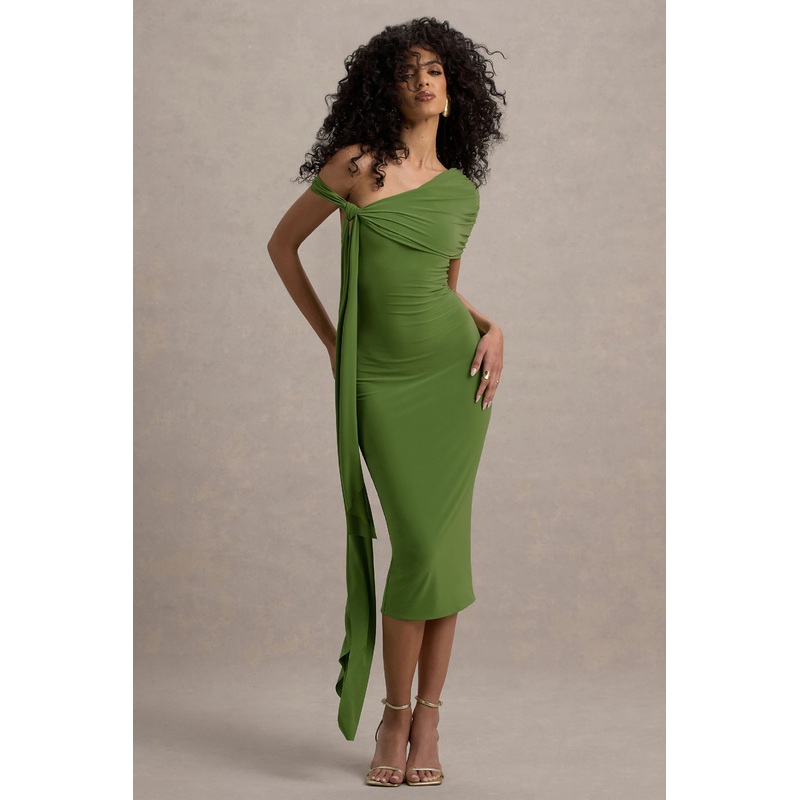 Curate a timeless collection of midi dresses starting with Vallea, our stand-out staple. Arriving in a beautiful green shade of our dual-layered jersey, this form-flattering piece boasts an asymmetric neckline, long drape detail and functional split hemlin