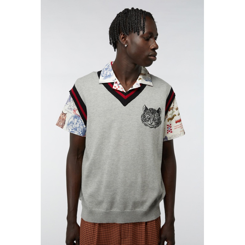 Knitted Vest – Sleeveless Style – V-Shaped Neckline – Relaxed Fit – ‘Alice’ Themed Placement Graphic On Front And Back – Ribbed Knit At Hems And Neckline – Made From Soft Knitted Cotton – Available In Grey