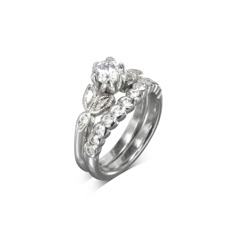 The Vintage Diamond Engagement and Wedding Ring Set features intricate diamond accents arranged in an organic leaf pattern.Handmade in Precious Metals: The Vintage Diamond Engagement Ring is lovingly handmade in your choice of platinum, 18ct yellow gold, o