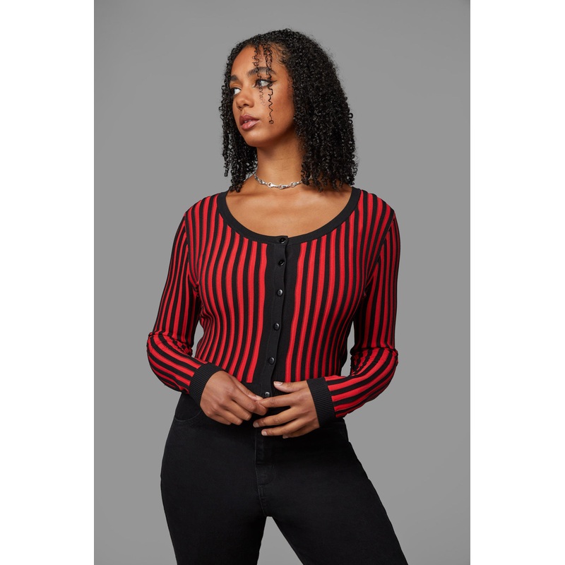 Textured Cardigan -Cardigan Is Constructed Using A Contrast Rib Fabric-Features Button Front-Round Neck-Fitted Style-Made From Rayon Nylon Blend-Available In Black, Red & Silver Product Code: BGFX083