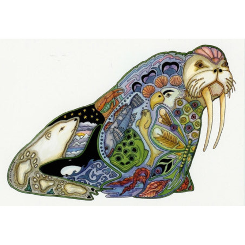 Strong and easily provoked this huge sea mammal can reach up to 12 feet in length, with huge tusks. However, he is normally shy, and uses his tusks to help climb out of the water onto the ice, or to hold onto the bottom of the sea floor while digging for clams. See within the large predators the Polar Bear and Orca, who Walrus is keeping a watch out for. When not sun bathing, home is in the water with fish, mussels, Octopus, and Seal. See the companion Frog who like the Walrus, connects water and earth. The Walrus is endangered, although several countries have passes laws to protect them. The Pacific Walruses numbers have risen, however Atlantic Walrus is still very much endangered. Look for the Ladybug, who brings happiness and prosperity!