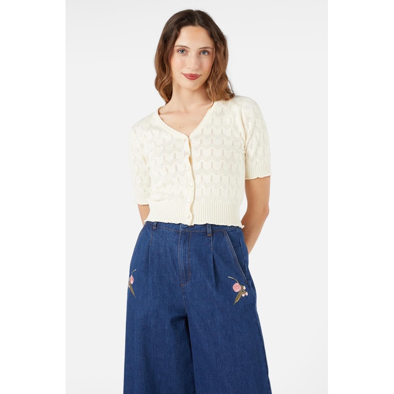 Short sleeve, knitted cardigan with a v-neckline. Made of a lightweight cotton, perfect for summer- short length sleeves - v neckline - button through front - lace style knit detail - made of cotton - available in cream & mustardProduct Code: PGFZ032