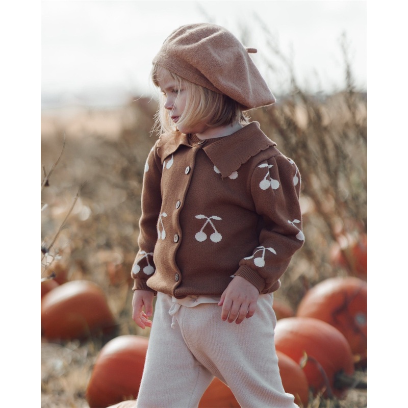 Adorable and utterly charming, this light brown cardigan features white cherry motifs that bring a playful yet elegant touch. Designed with a beautiful collar and subtle balloon sleeves, the cardigan also includes ribbed cuffs for a comfortable and flexible fit. The White Cherry Cardigan is sure to stand out with its uniquely sweet design.