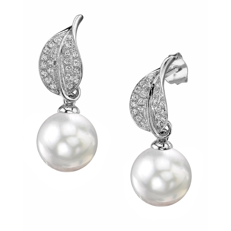 These exquisite pearl and diamond earrings feature stunning 9.0-10.0mm White South Sea Pearls sourced directly from the pristine waters of Western Australia. You’ll appreciate their sharp, crisp luster and the colorful natural overtones that give each pearl its unique character. The solid 18K gold earrings showcase a graceful leaf motif, perfectly complemented by dazzling SI clarity diamonds weighing approximately 0.23cttw. When you wear these earrings, you can expect a touch of luxury that’s both elegant and eye-catching.