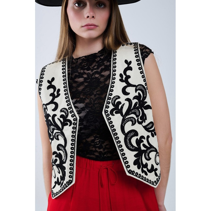 Timeless elegance meets modern sophistication in this stunning white vest, beautifully adorned with intricate black Baroque embroidery. The striking contrast between the crisp white fabric and the ornate black detailing adds a touch of opulence, making this vest a true statement piece. Designed to enhance any outfit, its refined aesthetic effortlessly blends classic and contemporary style.