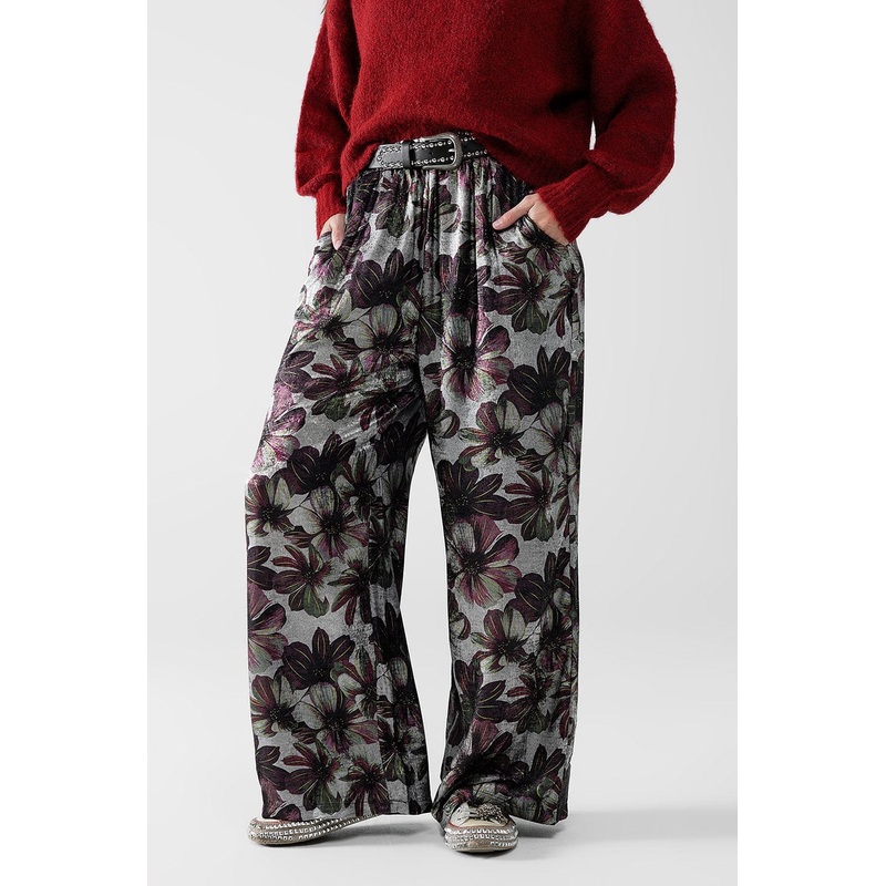 These wide-leg pants in a stunning floral print combine elegance and comfort with a touch of glamour. The metallic effect fabric catches the light beautifully, making them an eye-catching choice for special occasions or evenings out. The relaxed fit and elastic waistband ensure a flattering silhouette and all-day comfort, blending style with practicality.