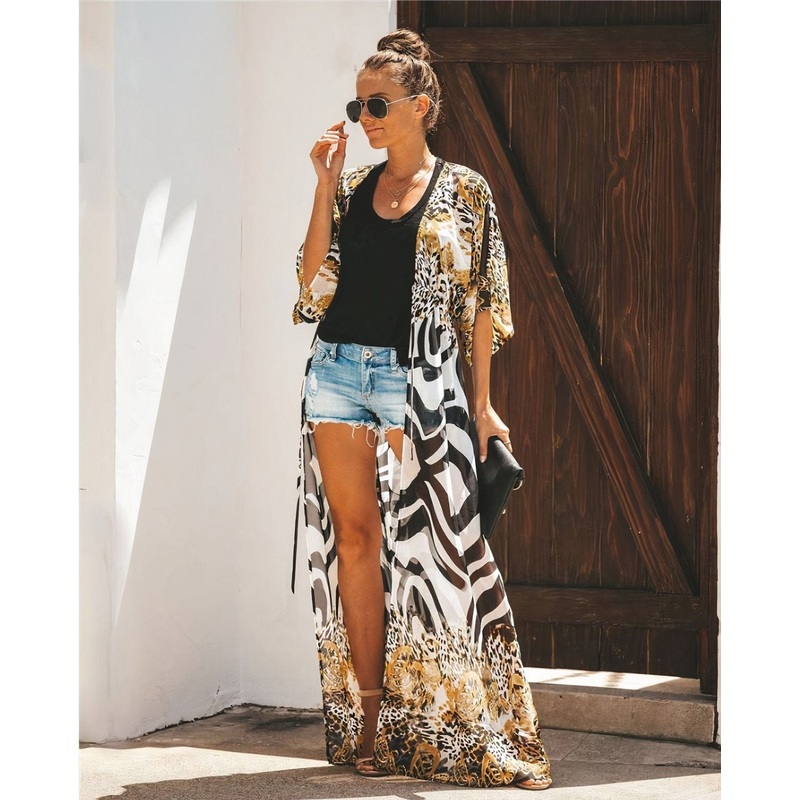 Open and loose chiffon dress with waist drawstring. Wear it over a tank top or at the beach over your bathing suit. Fun, geometric print. One size.