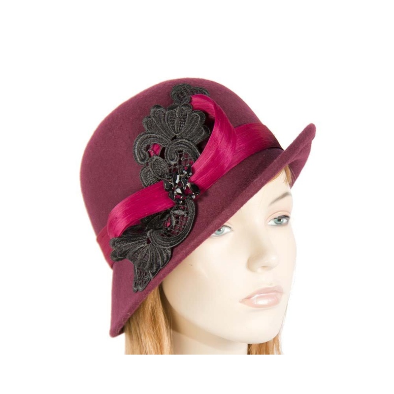 Classic burgundy wine bucket cloche winter felt hat with luxurious black lace, shiny ornament and silk abaca embellishment. – Made in Australia – Pure wool felt – Bucket shape