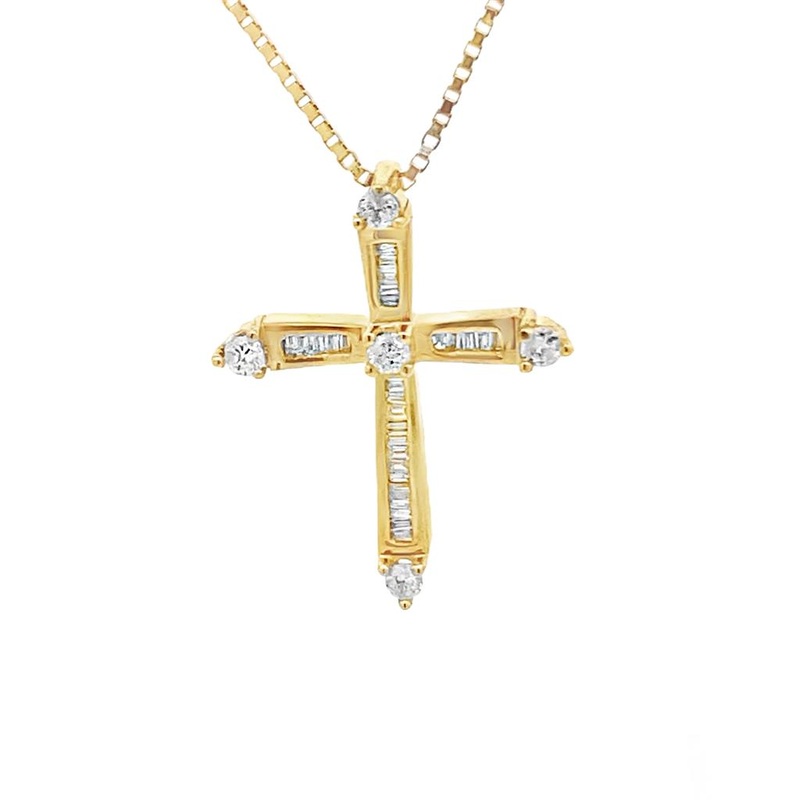 Yellow 14 Karat Cross Estate Jewelry Length 25.5 With 5 0.19TW Round Diamonds And 28 0.31TW Baguette Diamonds Gram Weight: 6.9